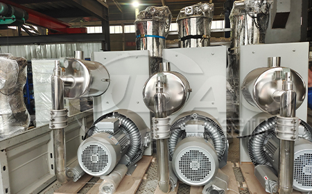 真空上料機由真空泵(無油、無水)、覆膜濾袋過濾器、壓縮空氣反吹裝置、氣動放料門裝置、真空料斗和不銹鋼可調(diào)吸料槍、輸送軟管等部件組成。