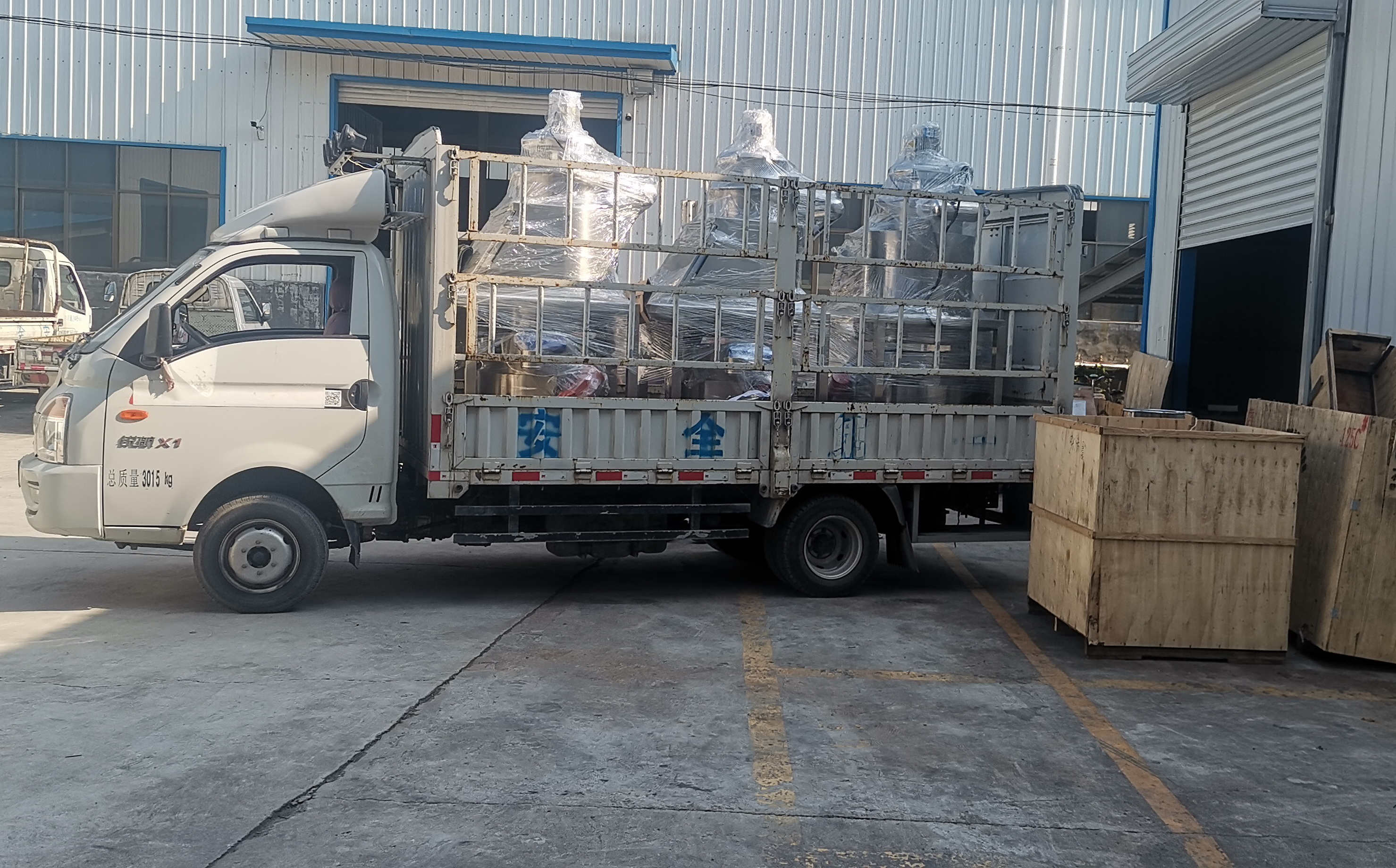 暴雨過(guò)后恢復(fù)供水供電第一天,專(zhuān)車(chē)?yán)@路給山東菏澤客戶(hù)送無(wú)塵投料站三臺(tái)