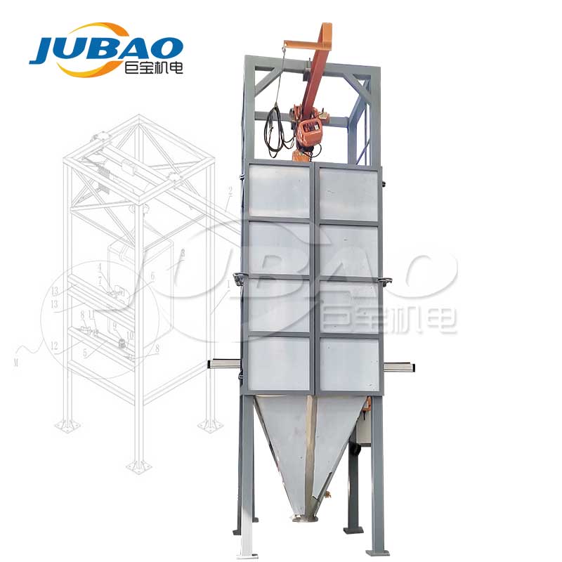 為了彌補這一設備缺失,巨寶公司特設計了一款用于物料自動拆袋卸料作業(yè)的機械設備——自動破包機。它是一款高度自動化的機械設備,可有效避免人體與物料的直接接觸,只需單人操作,通過人工手動將物料放置在皮帶上料機處或者用叉車等工具將物料袋直接提升至設備機箱內(nèi),而后便可在自動拆包機設備內(nèi)部完成整個拆袋卸料過程。特別是針對一些含硫粉末,因其顆粒較小,很容易在拆袋卸料過程中產(chǎn)生粉塵污染,使用自動拆包機作業(yè)則能避免粉塵溢出設備機箱外,造成污染。同時自動拆包機搭配的內(nèi)置除塵吸附裝置也會及時工作,將粉塵吸附達到環(huán)保的設備功用。