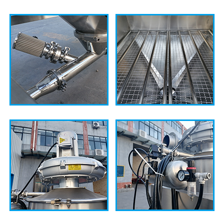 1.無塵篩分投料站分為上、下兩個主部件,上部為粉塵收集,下部為原料過篩或原料輸送。