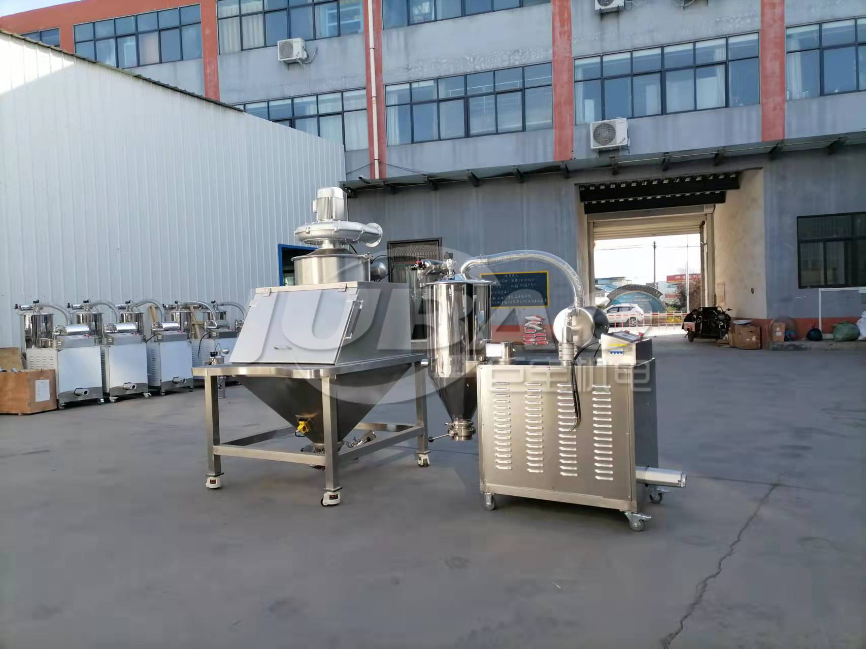 物料經由無塵投料站下料后,我們可以使用一個適配器將下料倉的出料口和真空上料機的吸料管連接在一起,這樣從投料到真空上料機再到下游的加工設備全程都能達到無塵化的效果,整個車間也就更加潔凈。為了節(jié)省空間以及成本,一臺無塵投料站也能給多臺真空上料機供料。