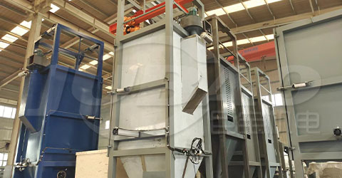 噸包拆包機(jī)工作原理:人工將原料包裝袋放置在輸送皮帶機(jī)上,皮帶輸送機(jī)包裝袋送至拆包機(jī)內(nèi),由旋轉(zhuǎn)破包裝置將包裝袋割開,原料由滾動篩篩孔落入出料受料斗內(nèi),包裝袋由旋轉(zhuǎn)的滾筒旋至排袋機(jī)排除,割包產(chǎn)生的揚(yáng)塵經(jīng)自動拆包機(jī)自帶的布袋除塵氣處理,布袋收集的粉塵通過脈沖清灰裝置落入拆包機(jī)內(nèi),實(shí)現(xiàn)的粉塵的再次利用,經(jīng)布袋除塵器處理的空氣可以直接排放在室內(nèi)。噸袋拆包機(jī)拆解的原料經(jīng)出料螺旋,可以配套提升機(jī),螺旋輸送機(jī),管鏈輸送機(jī),氣力輸送,進(jìn)行配料,攪拌,包裝。