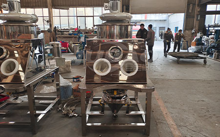 5)離心風(fēng)機(jī):是整個(gè)除塵系統(tǒng)的動(dòng)力元件,用來形成一定負(fù)壓,阻止粉塵外泄,并抽走篩分物料時(shí)彌漫的粉塵,無(wú)塵投料站方便設(shè)備操作。