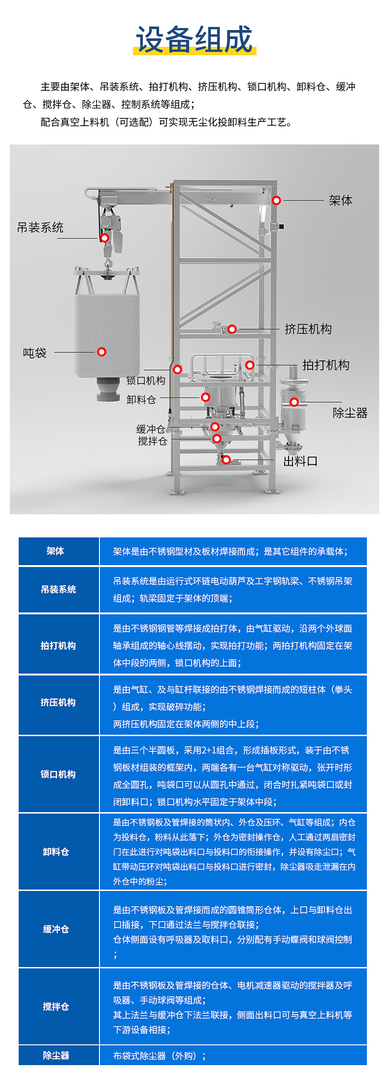 主體結(jié)構(gòu):卸料站框架支撐結(jié)構(gòu)、噸袋起重裝置、噸袋吊架、噸袋支撐按摩板、袋口控制閥、密封裝置。
