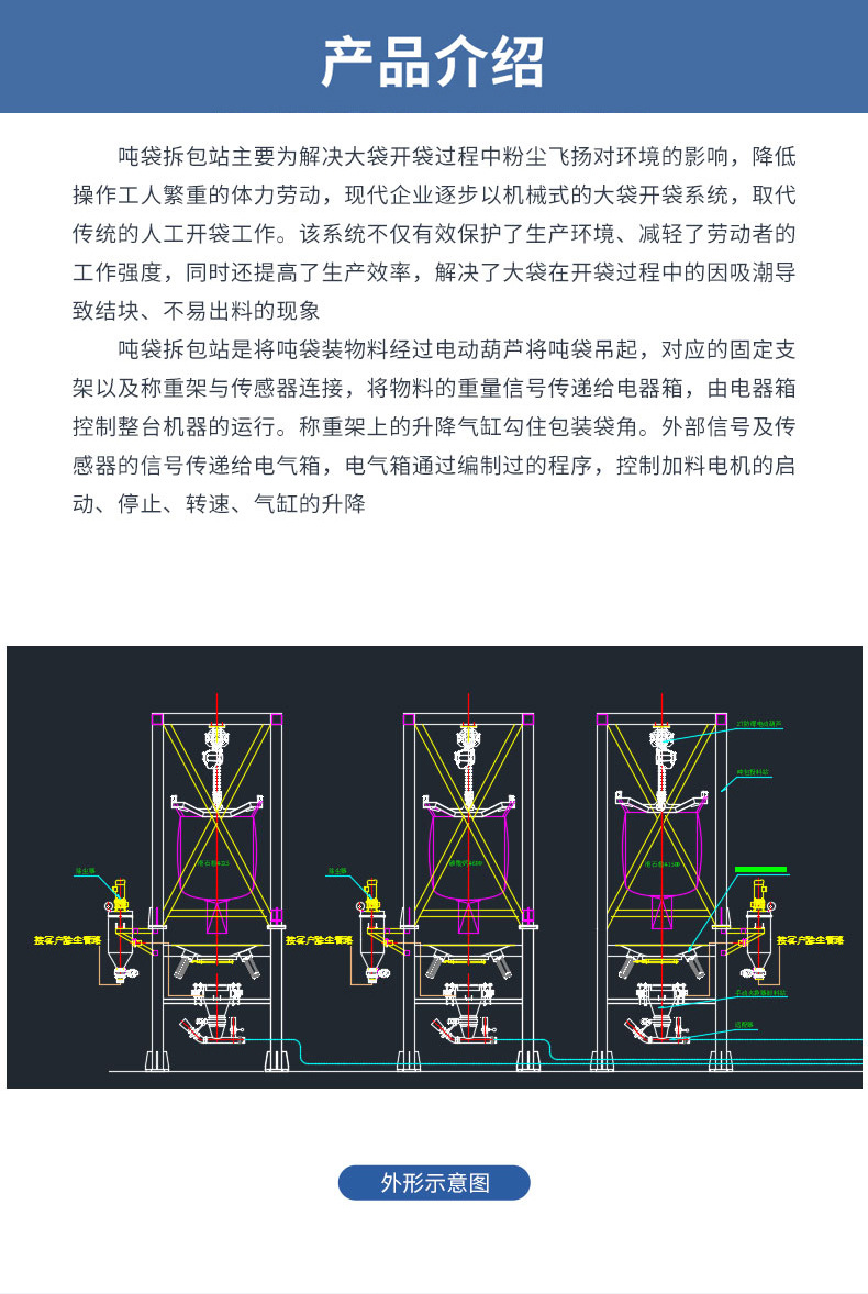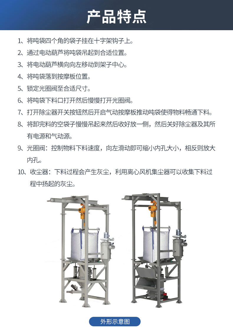 噸袋及大袋類包裝粉料,半自動化完成粉體卸料輸送工作,在卸料投料過程中不產(chǎn)生揚(yáng)塵。采用電動葫蘆或行車提升噸袋至卸料口。人工引導(dǎo)套袋,完成自動夾袋。夾袋后松開扎帶,操作葫蘆自動提升,物料落下。噸袋卸料站 噸袋拆包機(jī)底部可連接真空上料機(jī)管道可完成提升功能。" />