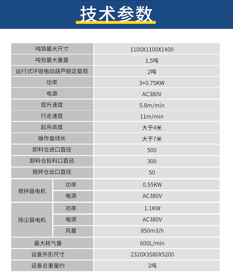 起重設(shè)備:自身攜的帶起重設(shè)備將大袋(噸袋)吊裝到卸料機(jī)的機(jī)架上,不需用外界的幫助。
