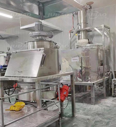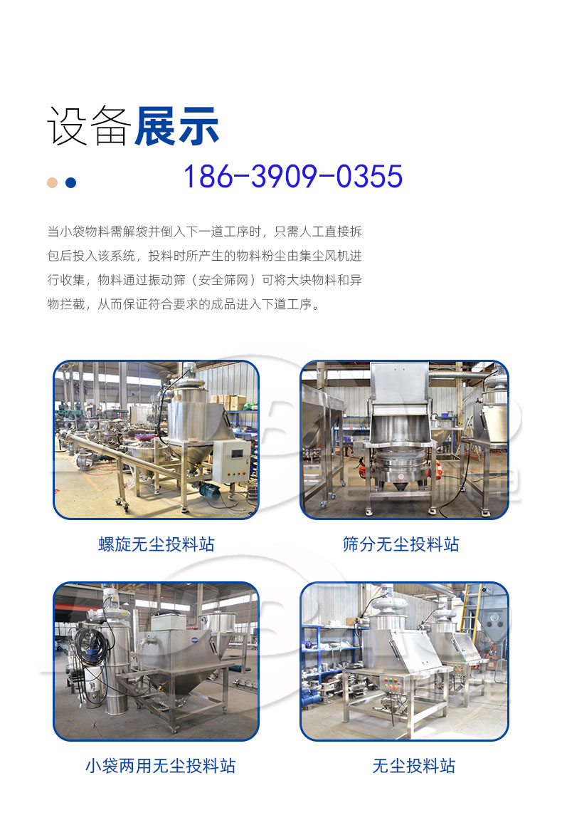 無塵投料站由投料平臺、卸料倉、除塵系統(tǒng)、振動篩等部件組成結(jié)構(gòu)簡單,操作方便,維護(hù)成本低,自動化控制,安全穩(wěn)定。另外加裝篩分振動裝置,利于下料以及管道輸送,并且避免投料過程中異物進(jìn)入物料。采用智能控制,自動化程度高,操作簡單便捷,容易拆洗清潔維護(hù)。
