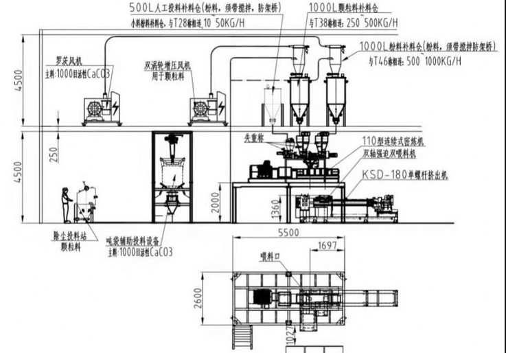 連續(xù)式定量給料系統(tǒng)主要由投料站、真空上料設備、補料倉、失重式喂料機、集料斗、控制系統(tǒng)等組成。由人工將物料投于投料站,上料機將物料輸送至補料倉,再補料到失重秤,由失重秤精確計 量定量喂至擠出機等下游設備