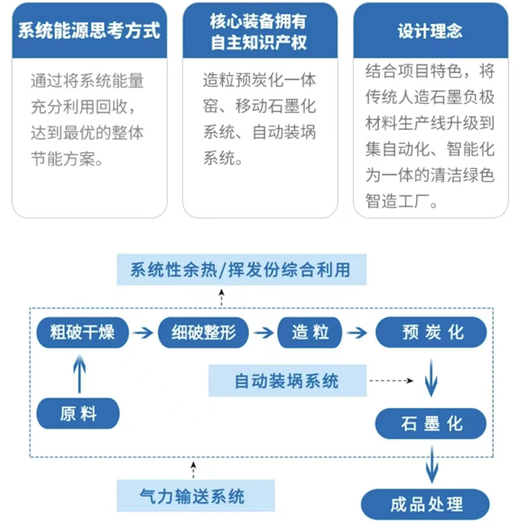 以石油焦、針狀焦、瀝青作為原料,提供破碎、造粒預(yù)炭化、石墨化、成品處理四大工序的整體設(shè)計(jì)方案,獲得高端儲(chǔ)能、動(dòng)力電池負(fù)極材料。