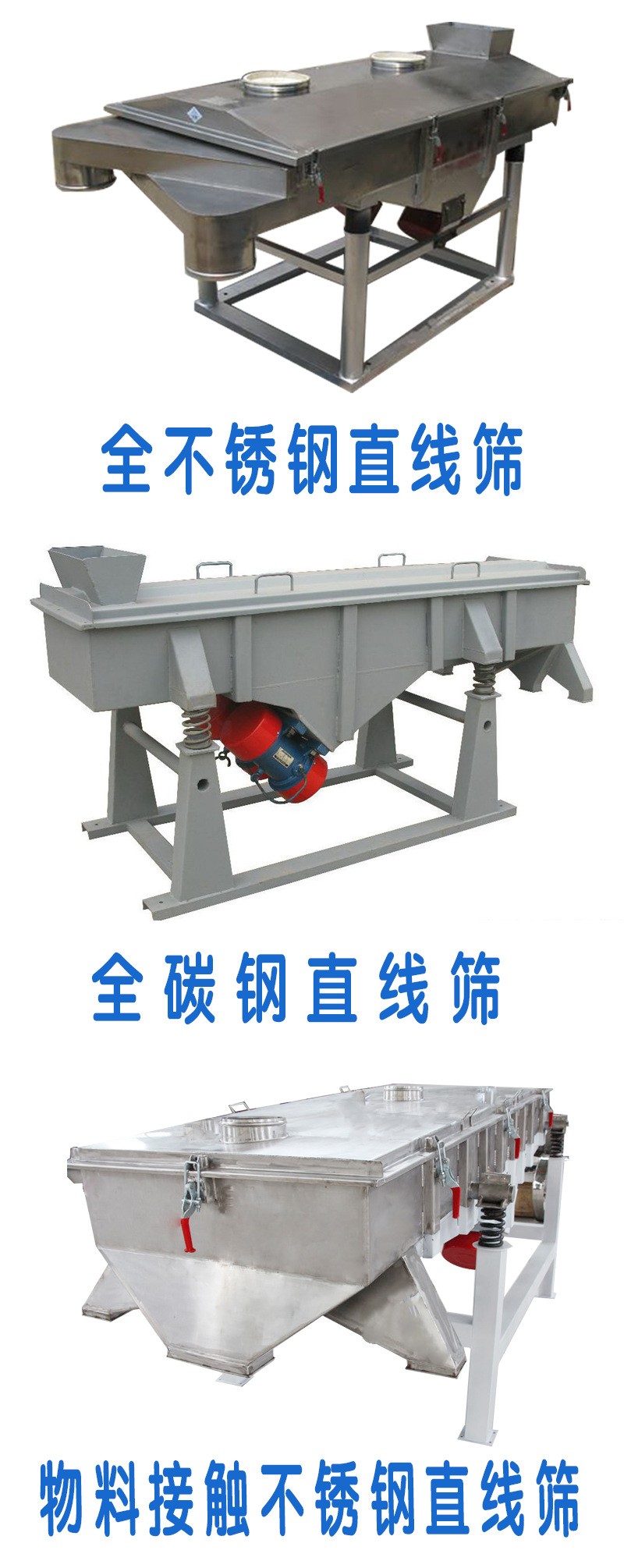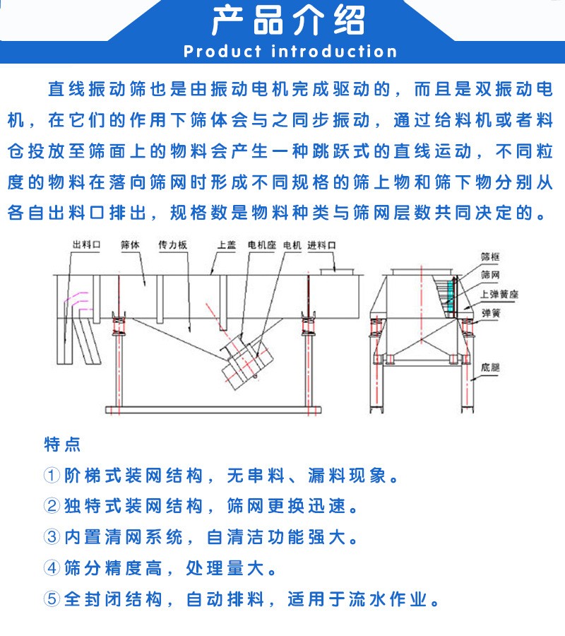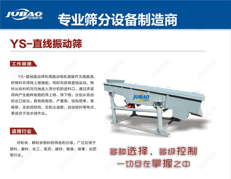 產(chǎn)品特點(diǎn):直線振動(dòng)篩主要用于粉狀或顆粒狀物料篩分及液體物料過(guò)濾,篩分細(xì)度可達(dá)325目/英寸;根據(jù)客戶要求可單層或多層使用,可達(dá)五層。