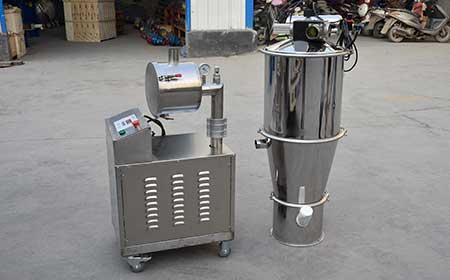 手推式真空上料機(jī),氣源是移動(dòng)形式方便挪動(dòng)。也是利用真空泵抽氣,使吸料嘴進(jìn)口處及整個(gè)系統(tǒng)處于一定的真空狀態(tài),粉粒料隨同外界空氣被吸入料嘴,形成料氣流,經(jīng)過吸料管到達(dá)料斗,在料斗中進(jìn)行氣、料分離。分離后的物料進(jìn)入受料設(shè)備。送料、放料是通過氣動(dòng)三通閥不斷地開、閉來完成的,而氣動(dòng)三通閥的開閉是由控制中心來控制的。真空上料機(jī)中裝有壓縮空氣反吹裝置,每次放料時(shí),壓縮空氣脈沖反吹過濾器,把吸附于過濾器表面的粉末打落下來,以保證吸料能正常運(yùn)行。產(chǎn)品廣泛的用于食品、醫(yī)藥、化工、塑料、無紡布、化纖、石墨等行業(yè)