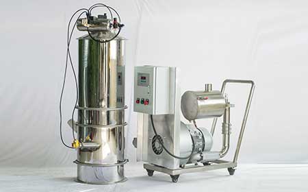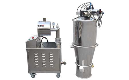 1、真空泵通過真空輸送設(shè)備的分離容器產(chǎn)生真空。將物料從進(jìn)料口通過吸料軟管與吸料口吸入。