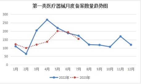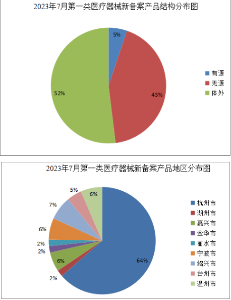 ??? 2023年7月,浙江省內各市市場監督管理局共新備案第一類醫療器械產品154個,其中有源類8個,無源類66個,體外診斷試劑80個(具體產品見附件)。