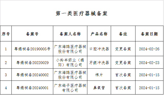 ??? 根據《國家藥監局綜合司關于加強第一類醫療器械備案管理的通知》(藥監綜械注〔2023〕89號)、《國家藥監局關于第一類醫療器械備案有關事項的公告》(2022年第62號)等文件要求,現予以公布揭陽市2024年度第一季度第一類醫療器械產品目錄。