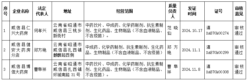 ??? 根據(jù)《昭通市藥品零售企業(yè)行政許可事項(xiàng)申辦程序和監(jiān)督管理規(guī)定(試行)》(昭通市食品藥品監(jiān)督管理局公告2號)的規(guī)定,對威信縣仁興大藥房、威信縣健安大藥房分店、威信縣博信大藥房申請辦理《藥品經(jīng)營許可證》相關(guān)事項(xiàng)進(jìn)行了行政許可,依據(jù)《企業(yè)信息公示暫行條例》第五條的規(guī)定,現(xiàn)對許可情況予以公示,請社會(huì)各界予以監(jiān)督。