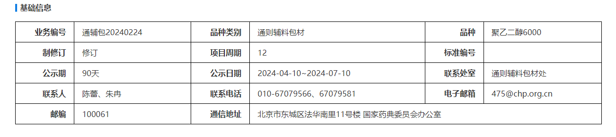??? 我委擬修訂聚乙二醇6000國家藥用輔料標(biāo)準(zhǔn)。為確保標(biāo)準(zhǔn)的科學(xué)性、合理性和適用性,現(xiàn)將擬修訂的標(biāo)準(zhǔn)公示征求社會各界意見(詳見附件)。公示期自發(fā)布之日起三個月。請認(rèn)真研核,若有異議,請及時在線反饋,并附相關(guān)說明、實驗數(shù)據(jù)和聯(lián)系方式。來函需打印后加蓋公章,個人來函需打印后本人簽名,并郵寄至我委通訊地址。